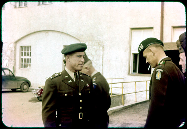 Several officers at Bad Toelz. Lieutenant on left is identified as Lt McKay, Lt with cigarette is Mederis.
