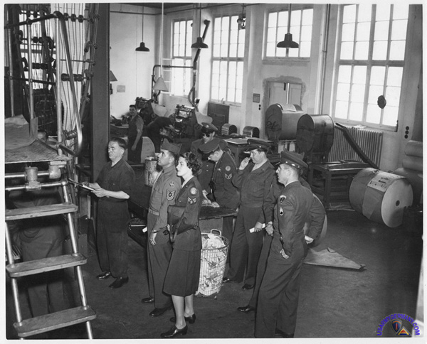 The STRIPES also has its own engraving plant, a battery of 13 Intertype machines to handle text and headline setting; one Linotype machine; Ludlow headsetting equipment; and four teletypesetter hookups. The later was also an innovation in Germany. The teletypesetters offer an economical production shortcut by using a method of setting type by means of a tape punched by an operator who may be miles away. (If anyone has photos or additional details on the equipment or operations within the plant, I would love to hear from them!)