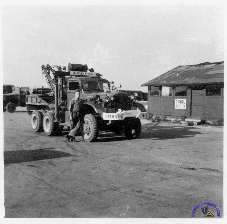 | Camp McCauley, Hoersching, c. 1947 - Emergency service wrecker. The 52nd Ord Gp operated an ordnance emergency service that rendered assistance to US personnel and dependents traveling along the autobahn through the Russian Zone between Enns and Vienna. The Group's dispatch office is in the building behind